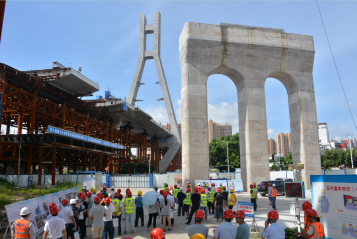 2020年6月28日,由龍巖城市發(fā)展集團有限公司主辦,龍巖市政建設集團有限公司(市城投公司)承辦,北京鐵研建設監理有限公司、中國建筑第六工程局有限公司、中冶(上海)鋼結構科技有限公司協(xié)辦的龍巖大道高架橋項目質(zhì)量安全標準化觀(guān)摩會(huì )在龍巖大道高架橋主橋鋼箱梁工程現場(chǎng)舉行。觀(guān)摩會(huì )分拼裝區域、提升站區域、頂推滑移區域、步履滑移區域及主橋轉體區域分別展示了龍巖大橋主橋鋼結構拼裝、提升、弧形頂推滑移、步履滑移等新工藝及主塔“水平二次轉體”、鋼箱梁頂推、斜拉索施工技術(shù)。