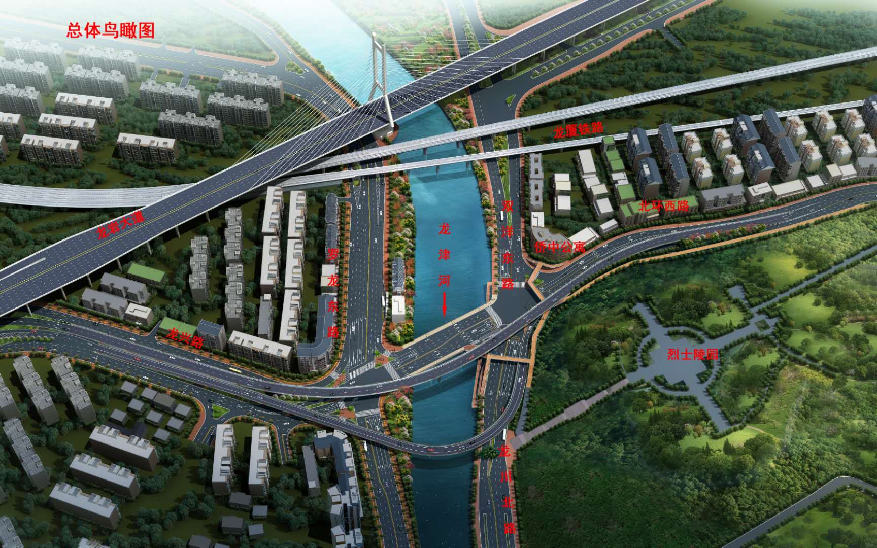 沿北環(huán)西路、龍興路設置南北分離式雙向四車(chē)道高架,南側接龍興路,北側接現狀北環(huán)西路,高架靠東側布置(緊貼烈士陵園),橋梁總長(cháng)約1140米,凈寬約7.7米;在雙洋路、龍川北路、北環(huán)西路設置人行天橋,與山體步道銜接,以完善慢行系統;在烈士陵園山體下采用明挖回填方式設置框涵,長(cháng)度約225米,凈寬10.75米。